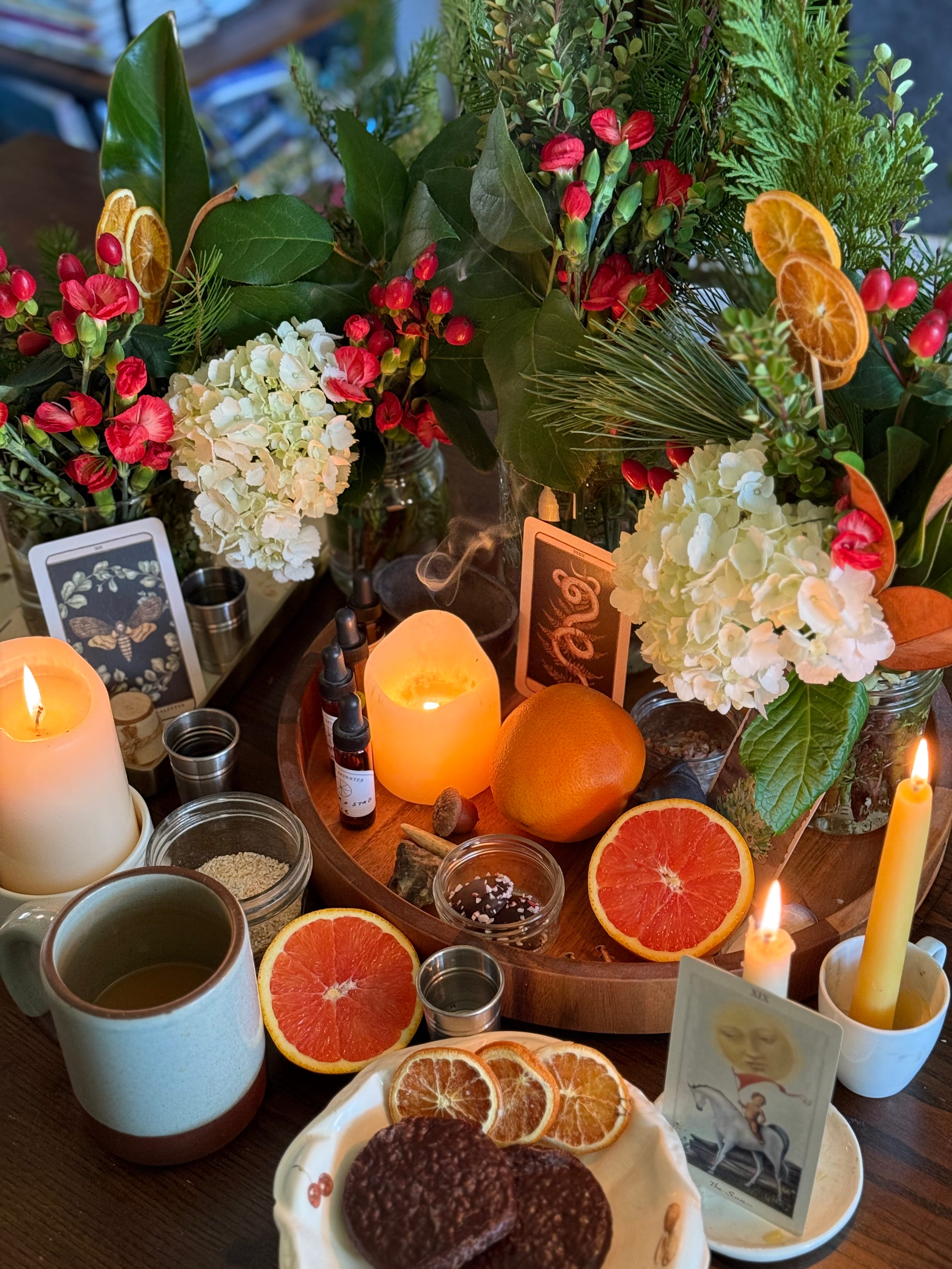 Included in my altar: oranges and candles, little Suns peppermint chocolate candies for my sister lebkuchen for the old Germans gin for the maternal grandparents oats for the Scottish, and paternal grandparents black tea and milk for the Irish stones, the bones of the Earth, and a little Yule log animals, pig and deer, a tiny bone antler incense smoke from garden sage and rosemary water for the parched cards: the Sun, spruce (Winter), the snake and fern (starting over), the moth and eucalyptus (an ending)